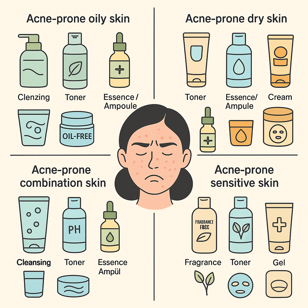 - 아침: 약산성 클렌저 → 무알콜 토너 → 가벼운 수분 앰플 → 오일프리 수분크림